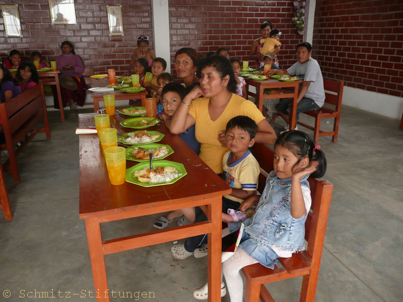 Bau und Ausstattung von sechs Gemeinschaftsküchen (comedores): Als zentrale Initiativen zur Überwindung von Hunger und Unterernährung gehören die Gemeinschaftsküchen oder „Comedores“ zu den wichtigsten Selbsthilfe-Initiativen der Bevölkerung. Frauen einer Gemeinde schließen sich zusammen, um an einem geeigneten Ort das tägliche Mittagessen für die Gemeindemitglieder zu kochen. Das Gemeinschaftskochen ist wesentlich billiger, als wenn jeder für sich kochen würde, die Frauen können beim Kochen die Kinder beaufsichtigen und das Sozialgefüge untereinander wird gestärkt. Durch das Projekt soll der Bau und die Ausstattung von insgesamt sechs Gemeinschaftsküchen finanziert werden. Das mittelfristige Ziel ist, in den neuen Küchen tägliche Mahlzeiten für rd. 800 Bewohner anzubieten.